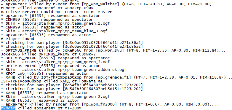 | слава12, слава12 надо поискать логи на жору обжору я его забанил а логи в какомто левом формате!!!!!! у него было как у этого адмирала!!! но у адмирала 1 раз я увидел, у жоры как минимум 2 одинаковых!!!!