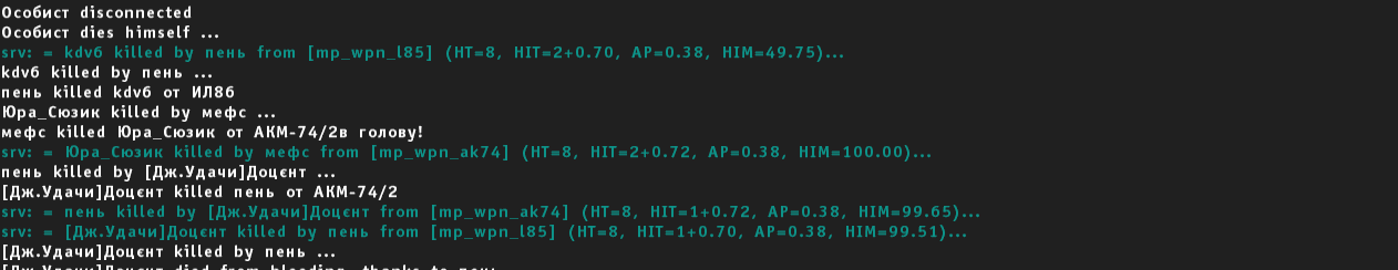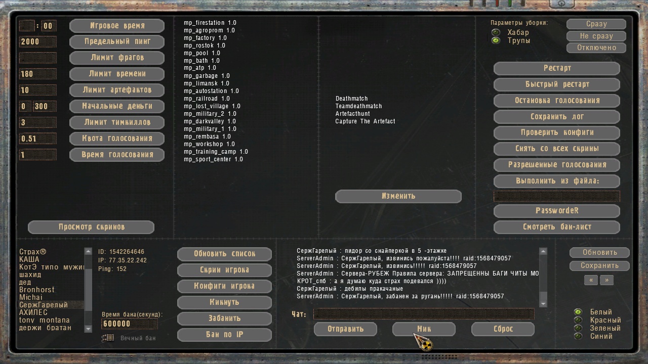 | Страх!Хотя это конечно не к тебе лично,но всё же.Как всё таки много бойцов банится за баги,выход за карту.А ведь есть дефолтная карта пожарка-антибаг,ставится на сервер.Если её использовать может это и решит проблему.Жалка ведь пацанов по дурику бан получивших.А потом серваки стоят пустые,играть некому,все потенциальные игроки в бане и забили на Сталка большой и толстый!Как ты думаешь?